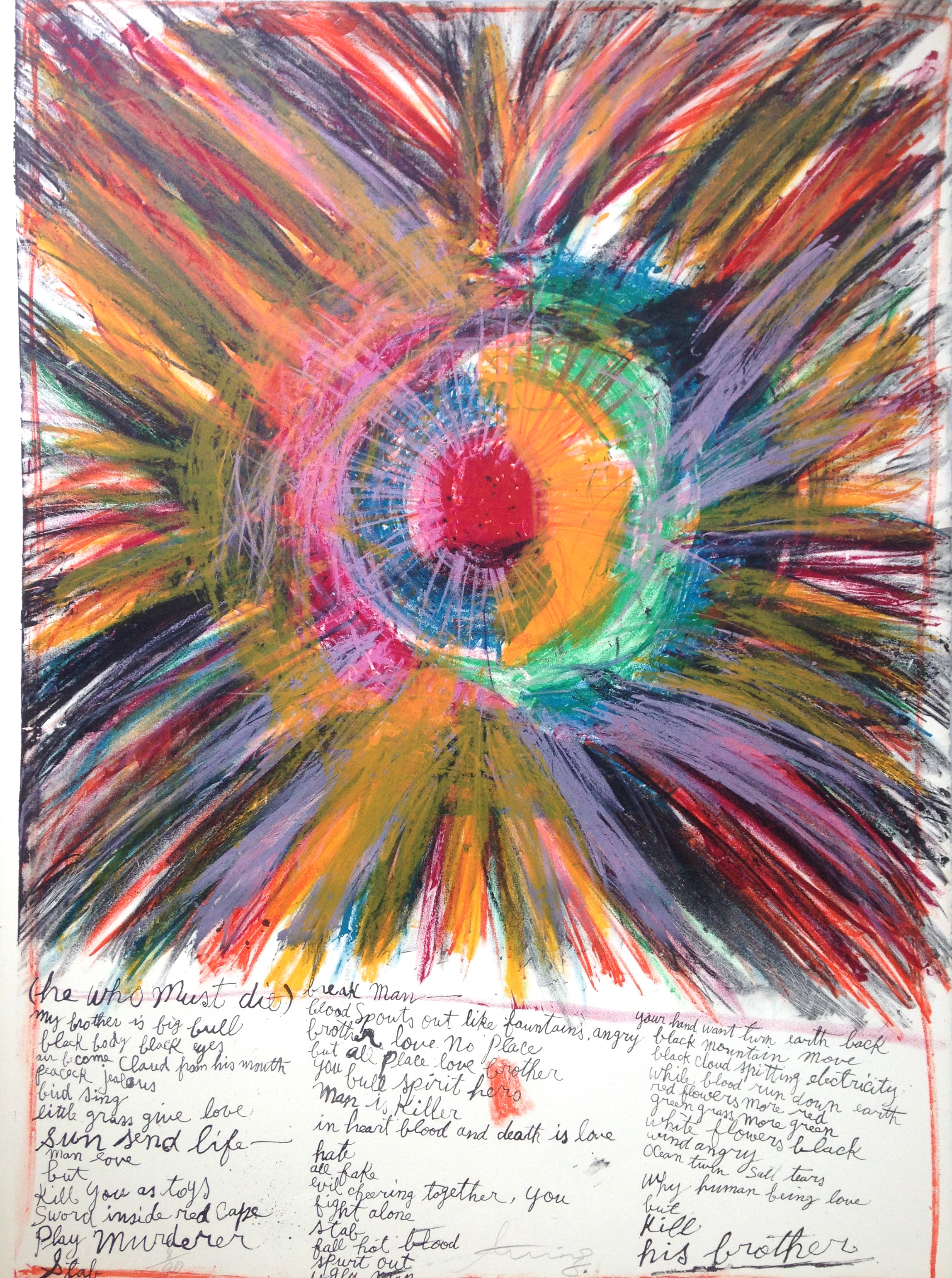 Bijzonderheden: Aan het begin van de jaren ’60 bracht Walasse Ting een groep kunstenaars (o.a. Lichtenstein, Karel Appel, Andy Warhol en Mel Ramos) bijeen, die gevangen zaten in het moment tussen het abstract expressionisme en de pop-art. In het boek ‘1 Cent Life’ brengt Walasse Ting deze kunstenaars samen, met zijn beeldende kunst en zijn gedichten. In dit historische kader wordt deze lithografie het best begrepen.